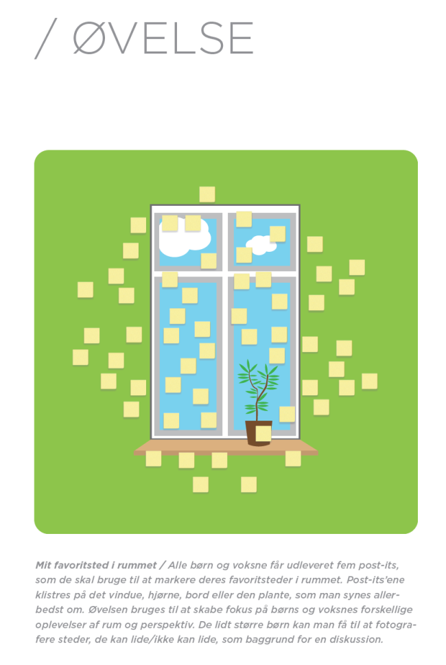 Øvelserne er fra bogen Læringsrum af Bodil Bøjer og Rune Fjord, udgivet hos Akademisk Forlag i 2013. Bogen handler om, hvad omgivelserne betyder for, at børn har det godt. Bogen beskriver, hvordan man kan skabe stor forandring, hvis man tænker rum og indretning med i det pædagogiske arbejde.